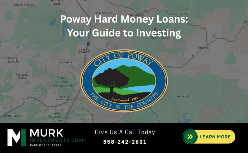 Don’t let slow financing cause you to miss out on the next great opportunity in Poway. Ready to explore Poway hard money loans? Contact Murk Investments today and give us a call at 858-242-2601 for a fast quote or apply online and and learn how our hard money, bridge, and fix-and-flip loan programs can help you achieve your real estate investment goals in Poway. Also ask about our “Half Price Doc Fees On Your First Loan” promo offer! We provide personalized service and expert guidance to help you succeed in San Diego County’s dynamic real estate market.
